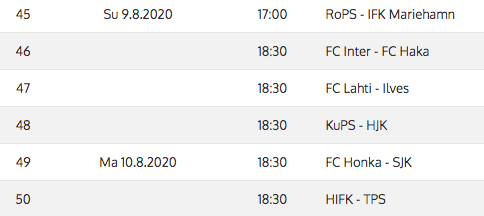 Upcoming Veikkausliiga Fixtures 9-10.8.2020