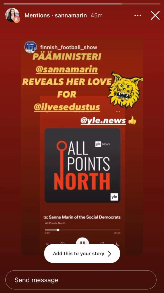 - Finland’s Prime Minister, who re-shared Keke’s story about her being an Ilves fan 🙌🏼