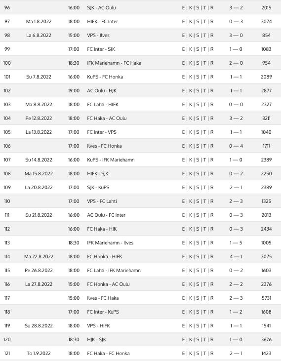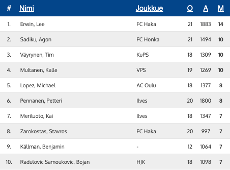 VEIKKAUSLIIGA AFTER 20 MATCHES