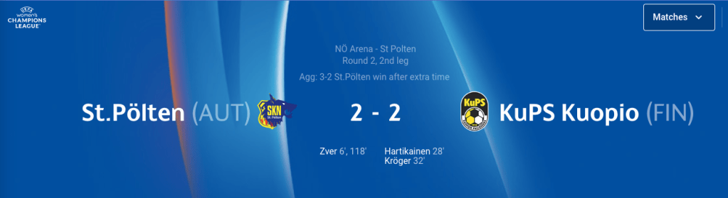 KuPS Kuopio Women narrowly lost 2-3 on aggregate to St.Polten from Austria.