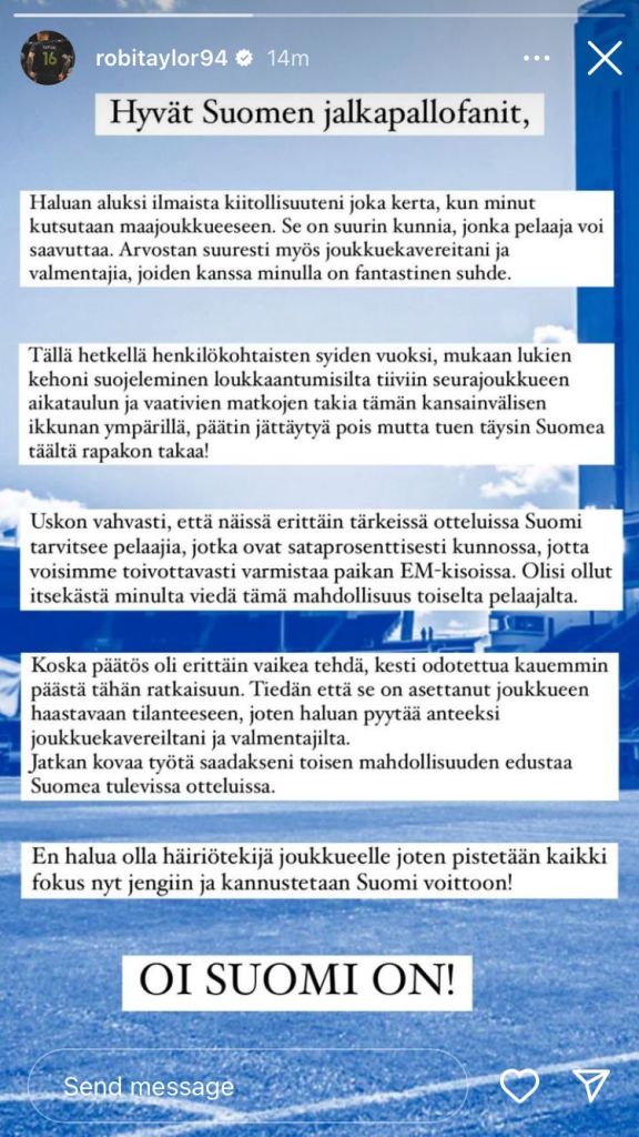 At the moment, due to personal issues, including protecting my body from injuries due to the tight schedule of the club team and demanding trips during this international window, I decided to leave, but I will fully support Finland from here behind the rapako!
